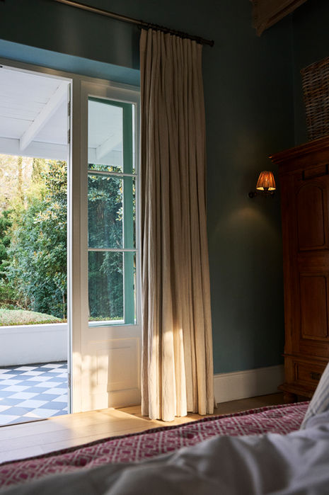French doors open onto a spacious veranda with an outdoor dining area and Weber BBQ, leading to a private pool area with sun loungers-perfect for alfresco meals, lazy afternoons, and quiet moments in the tranquil garden surroundings.